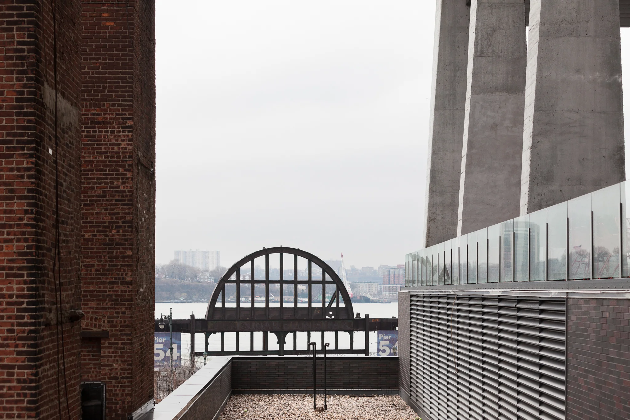 A view between old chimney stacks of a meat packing plant on the left, and the new Standard Hotel on the right, toward Pier 54, which is where the RMS Titanic was supposed to dock after her maiden voyage.